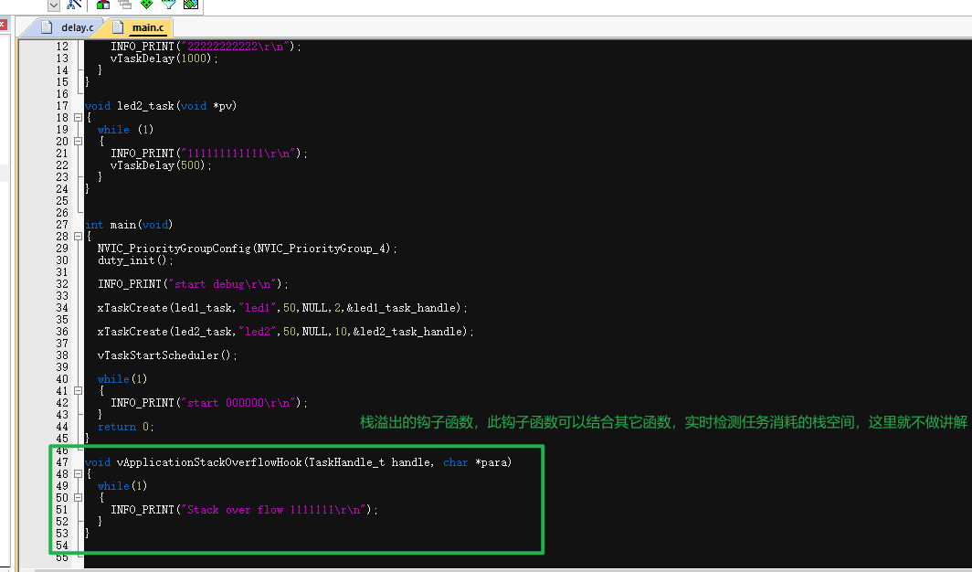 到此处再去编译以下工程,会报一个栈溢出的钩子函数未定义的错误,在main中定义此钩子函数即可,具体如下图: