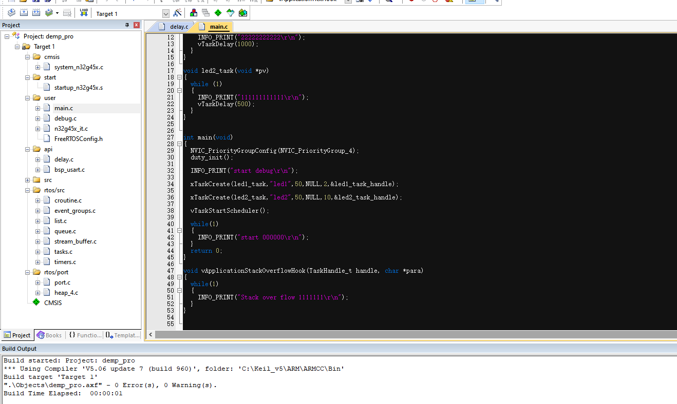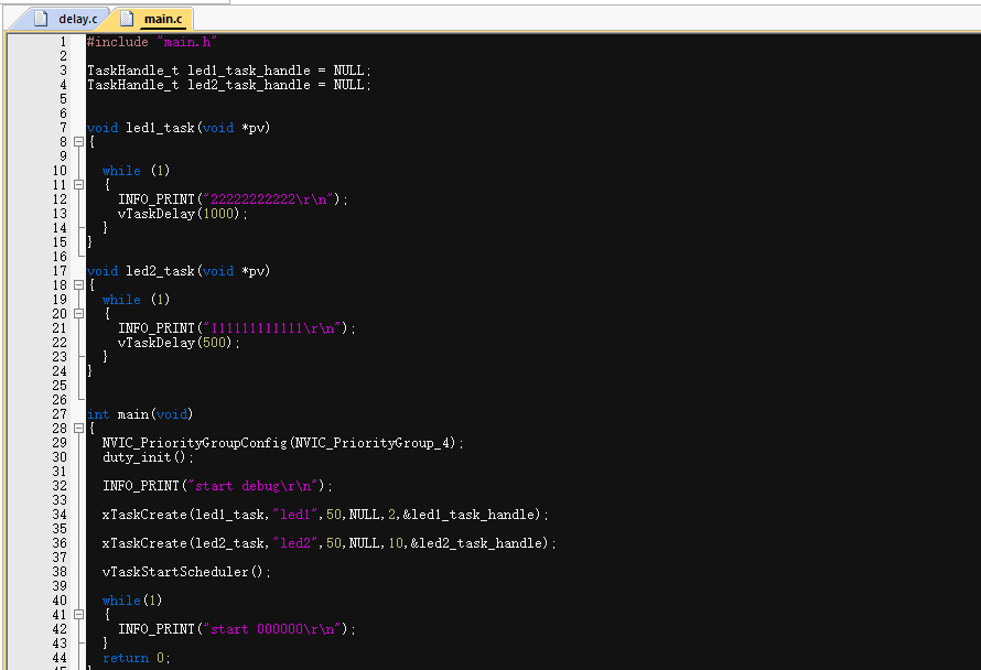 在main中编写如下程序,验证rtos是否移植成功,具体如下图: