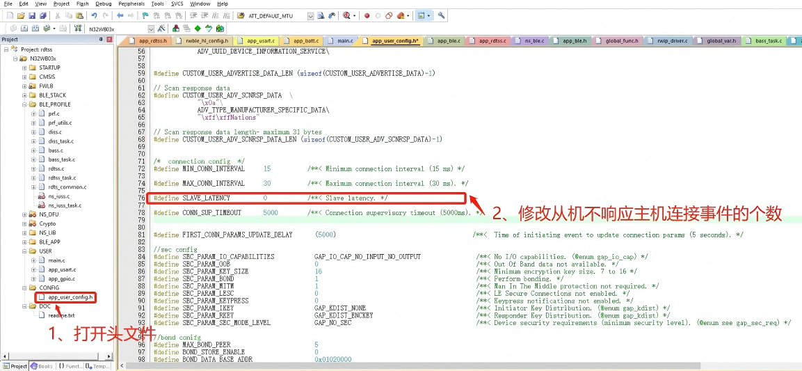 SLAVE_LATENCY—允许从机在没有数据要发送的情况下,跳过一定数目的主机连接事件,在这些被跳过的连接事件中,从机不必回复主机的数据包,这样可以降低功耗,SLAVE_LATENCY=0表示从机对于每一个来自主机的连接事件都进行回复,如果不回复,主机就会认为从机接收不正常。从设备延迟必须短于监控超时时间,且至少在超时时间内给从设备留出6次侦听的机会。从设备延迟<=(超时时间应/6/连接间隔)–1,SLAVE_LATENCY的范围可以是0-499。